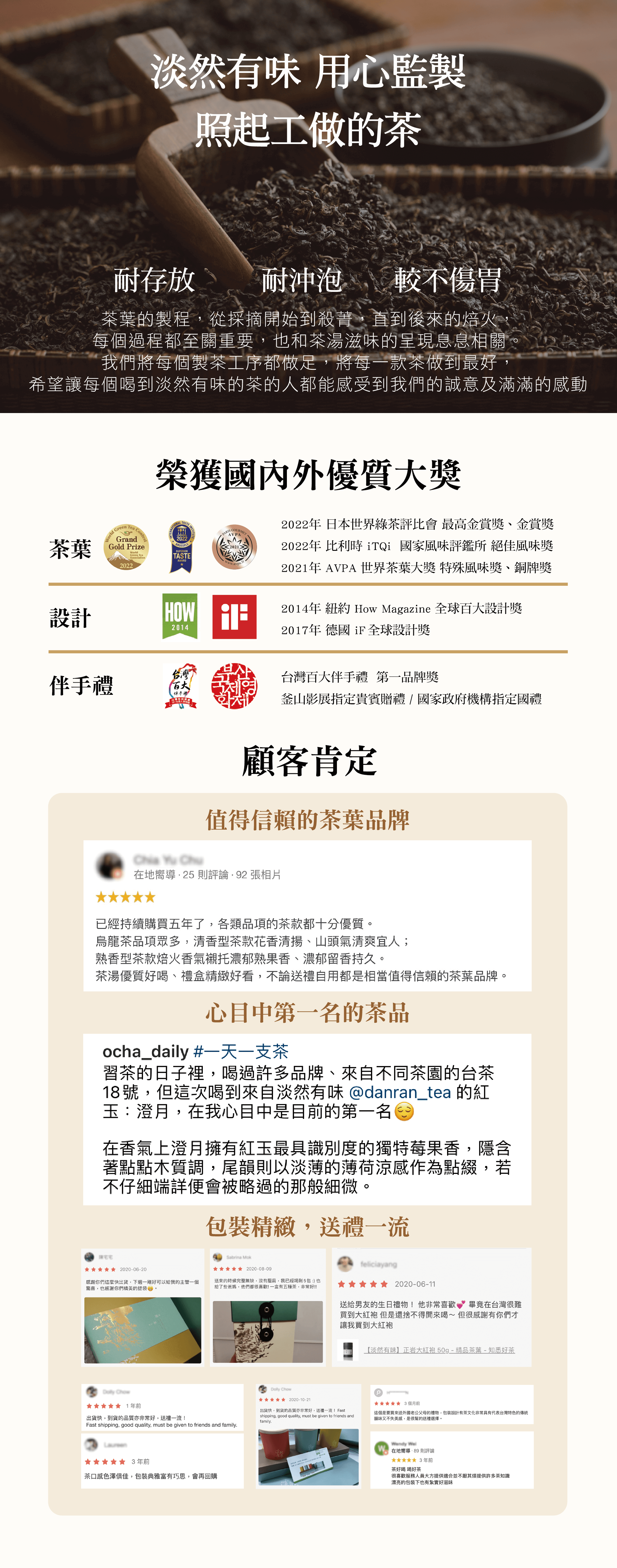 我們堅持只用台灣在地好茶,在有太陽的好天氣才開始第一道製茶工序,從日光萎凋、靜置、發酵等,沒有一道工序可以妥協,慢工細活地把關每一個細節,才能創作出符合品牌標準的「耐久泡」、「耐存放」、「最溫和」的最高品質嚴選好茶。