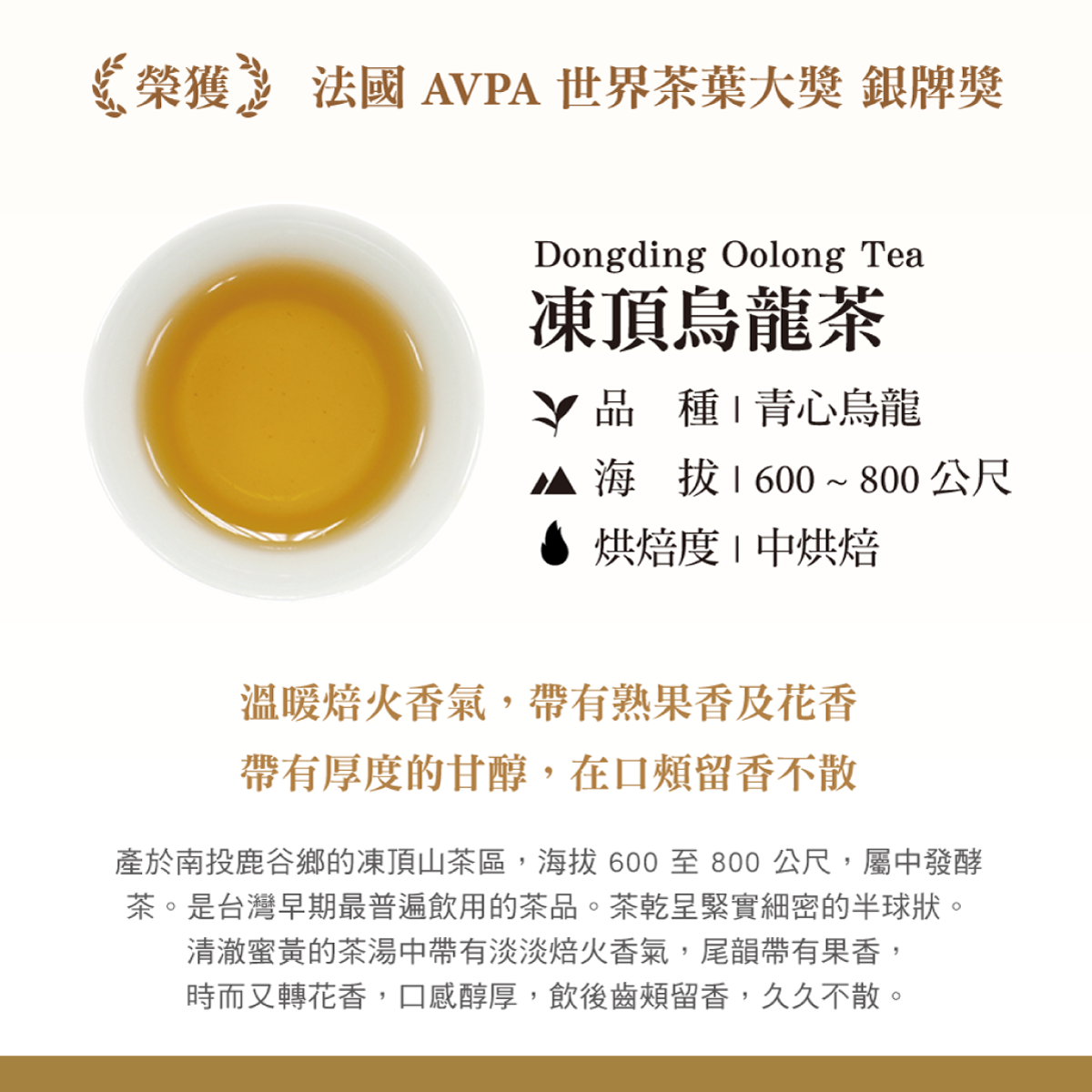 .【 凍頂烏龍茶10g 】溫暖焙火香氣,帶有熟果香及花香 🏆 榮獲法國AVPA世界茶葉大賽銀牌獎